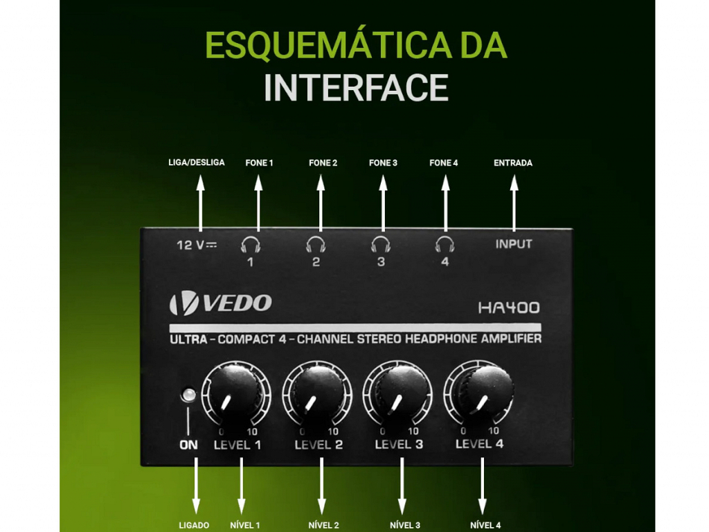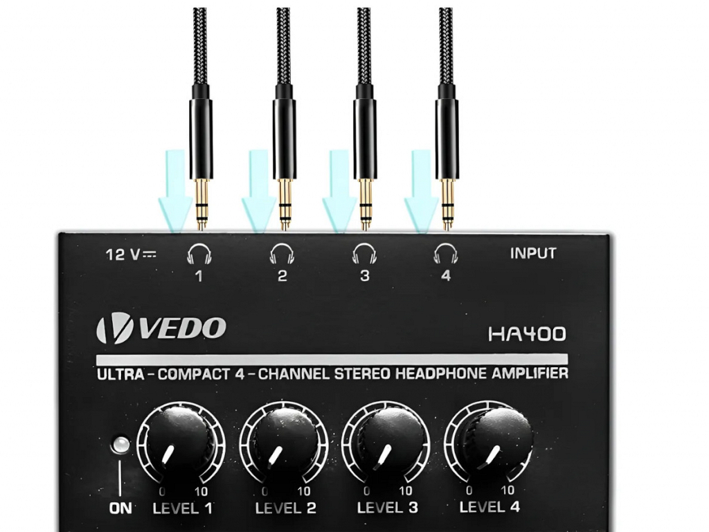 Ha400 Pré-amplificadores Amplificador Fone Ouvido 4 Canais Amplificador de fone de ouvido para monitor de 4 vias HA400 Amplificador de fone de ouvido Amplificador de monitor de fone de ouvido Amplificador de fone de ouvido estéreo ultracompacto de 4 canais MICROAMP HA400 Amplificador de fone de ouvido estéreo de 4 canais para todos os modelos de fones de ouvido 4 amplificadores estéreo de alta potência Ótima qualidade de som mesmo em níveis altos de volume Níveis de saída para cada canal O amplificador operacional 4580 de ruído ultrabaixo garante uma qualidade de som superior É fornecido um adaptador de alimentação de 12V CC. Uso combinado Você pode usar esse amplificador de fone de ouvido estéreo ultracompacto com qualquer um dos quatro fones de ouvido ao mesmo tempo. Quatro ouvintes no estúdio podem ouvir a mixagem principal durante a gravação, e cada ouvinte pode ajustar seu próprio volume usando o controle de nível de saída dedicado. O HA400 contém quatro amplificadores estéreo de alta potência que mantêm a máxima qualidade de som no volume máximo. Os amplificadores operacionais 4580 de ruído ultrabaixo oferecem excelente desempenho de áudio e são iguais aos instalados em equipamentos de áudio de tamanho normal, com um adaptador CC de 12 volts fornecido. Controle de volume separado para cada canal 1 entrada com conector estéreo de 6,3 mm Impedância de entrada de 100 Ohm 4 saídas com conector estéreo de 6,3 mm Impedância de saída de 80 Ohm Dimensões (L x A x P): 103 x 46,5 x 57,2 mm Fonte de alimentação de 12 volts incluída.