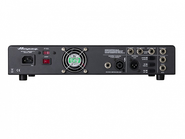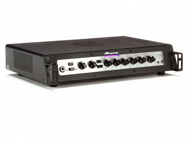 Cabeçote amplificador Ampeg PF-800 para contrabaixo, 800 Watts RMS, power-amp class D, pré-amp MOSFET, EQ-3 bandas, Compressor integrado, saídas 1/4″, saída XLR balanceada para gravação, FX loop, saída para fones de ouvido, entrada CD/Mp3 players.