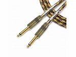 Cabo para instrumentos musicais e interligação de outros equipamentos. Fabricado com liga de cobre OFHC (Isenta de Oxigênio) e bitola de 0,50mm²/20AWG (G50). Montado com conectores P10 x P10 usinados em latão (CLA) banhados a ouro 18k, envelhecidos quimicamente e blindados com thermocontrátil interno. Revestimento têxtil Vintage