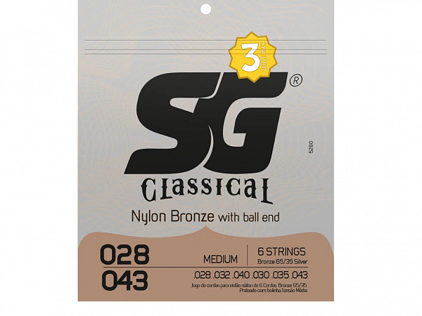 Pacote que contém três jogos de cordas SG Nylon Bronze com tensão Medium que trazem um som suave, quente, encorpado e brilhante. Muito utilizadas em estilos musicais que tradicionalmente tem o violão como a MPB, a Bossa Nova, o Samba e baladas Pop. Projetadas para trazer o maior equilíbrio tonal, sensação tátil suave e a dinâmica que todo violonista procura. Esta linha é feita com náilon cristal, que traz agudos mais brilhantes e os bordões trazem cobertura de bronze 65/35 que deixa o som grave mais direto e encorpado, sem perder o equilíbrio sonoro no conjunto inteiro. Medidas para uso em escala com comprimento de 650mm. Cordas primas em monofilamento de náilon cristal transparente. Bordões com revestimento de bronze 65/35 prateado e núcleo de multifilamento de náilon. Cód: 5280TP