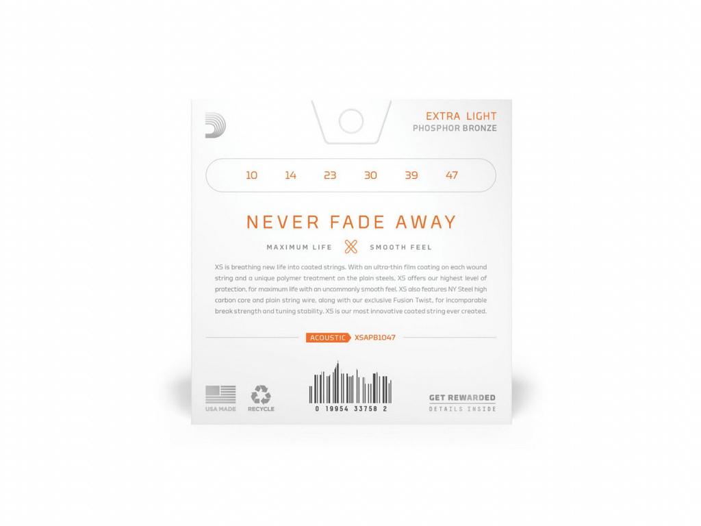 D'Addario XS Phosphor Bronze para violão aço representa o início de uma nova era em cordas revestidas. Com seu revestimento ultrafino em cada corda espiralada e tratamento de polímero exclusivo nas cordas lisas, a XS oferece durabilidade extrema com o mais alto nível de proteção, além de um toque surpreendentemente suave. Nossa exclusiva tecnologia Fusion Twist reduz o atrito da corda com o nut, assim você passa mais tempo tocando e menos tempo afinando. O consagrado núcleo NY D'Addario, com alta concentração de carbono, produz resistência e estabilidade de afinação incomparáveis. XS é a corda revestida mais inovadora já criada.