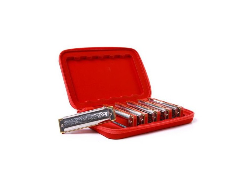Kit Free Blues contendo 06 gaitas com chapa de palheta fixada ao corpo de plástico ABS vermelho por 03 parafusos tornando a manutenção fácil. Som agradável e bem vedada.