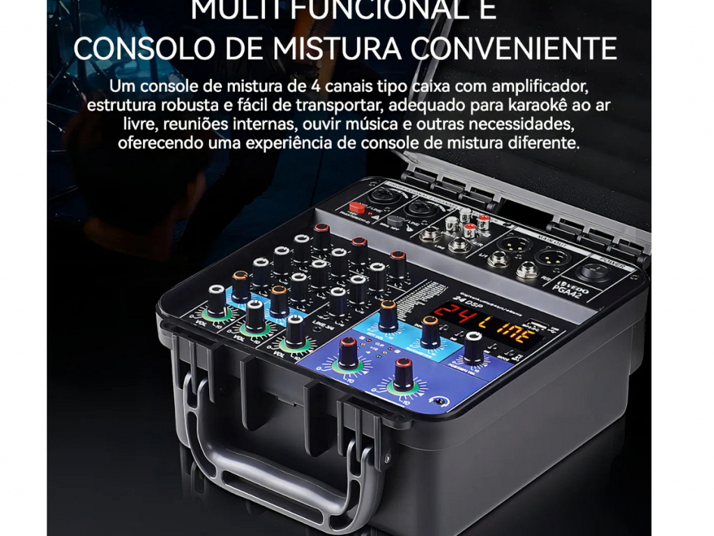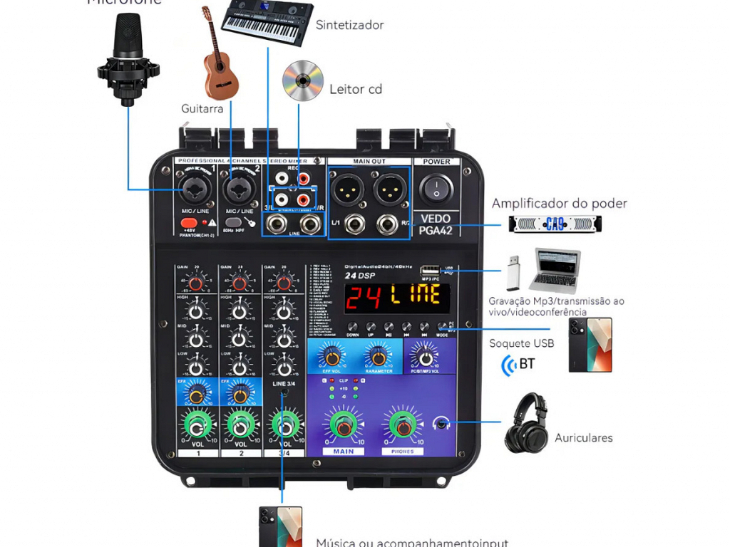 Você organiza eventos, karaokês, palestras ou pequenas apresentações e cansa de montar e transportar diversos equipamentos? Apresentamos o Mixer Amplificador Portátil VEDO PGA42, uma revolucionária central de áudio tudo-em-um projetada para artistas móveis, DJs, pregadores, instrutores e organizadores de eventos que exigem potência, versatilidade e robustez em um formato incrivelmente portátil e fácil de usar.