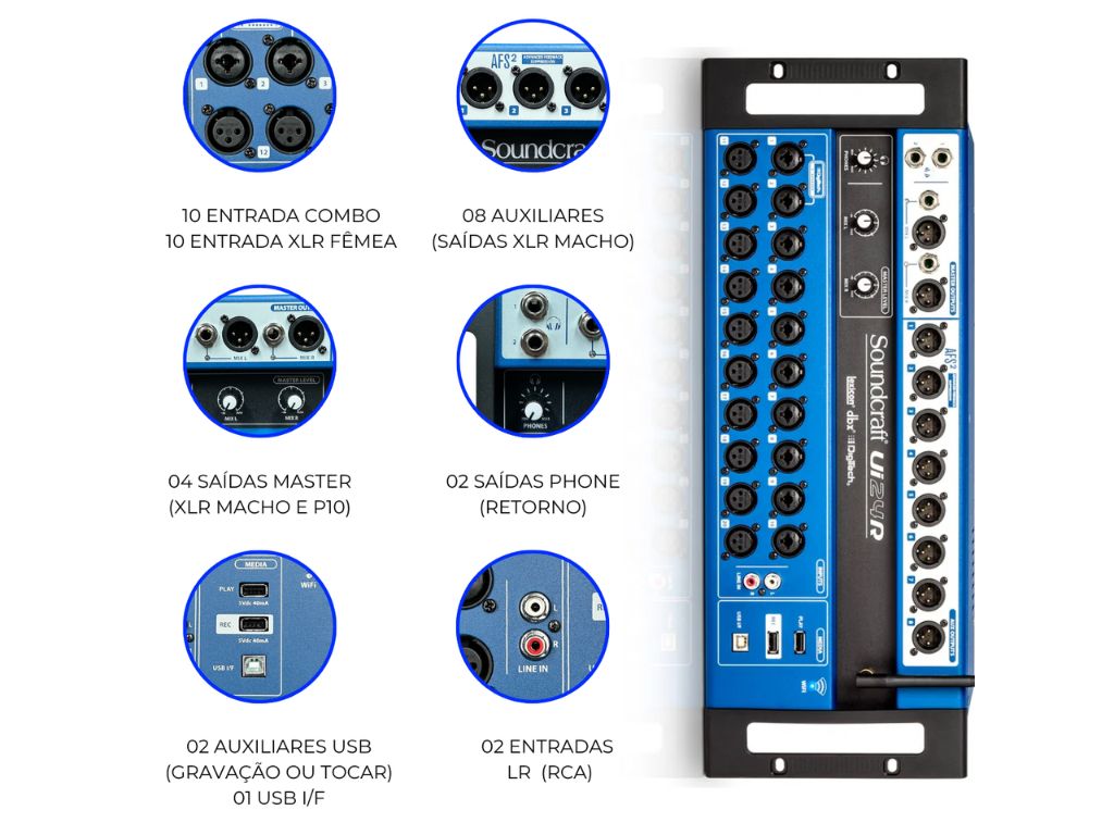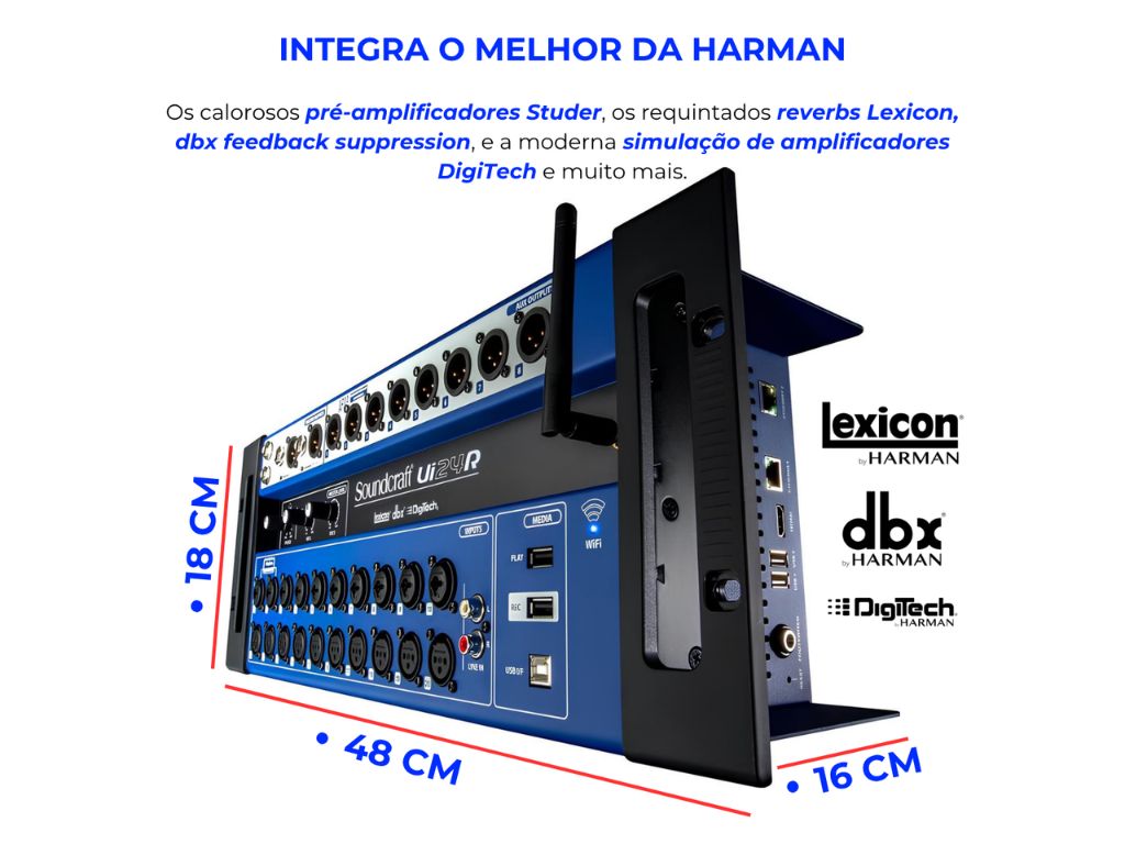A Soundcraft Ui24R é uma mesa digital profissional com 24 entradas, 8 saídas auxiliares e gravação multipista via USB. Com design compacto em rack 4U, controle remoto por Wi-Fi e operação via navegador, ela é ideal para igrejas, bandas, estúdios e eventos ao vivo.