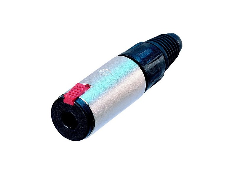 Conector (jack) de cabo/linha fêmea de 3 pólos para plugue P10 mono ou estéreo, corpo niquelado c/ trava.