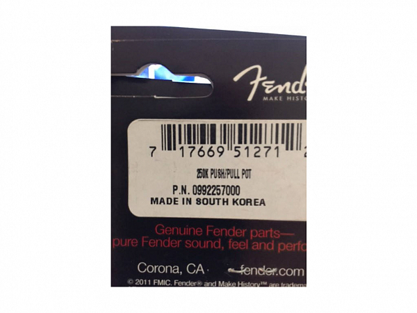Fender 250K Push/Pull Potentiometers, split shaft. Allows you to incorporate an annoying on/off double-pole, double-throw switch into an instrument without having to drill additional mounting holes. Mounting hardware is included. Brand New. Genuine Fender 0992257000.