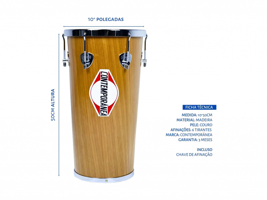timbre Autêntico: Pele de couro natural que proporciona graves encorpados e resposta sensível ao toque. Qualidade Profissional: Desenvolvido para músicos percussionistas que buscam excelência sonora e visual. Acabamento Sofisticado: Corpo de madeira envernizada e ferragens cromadas para maior durabilidade e elegância. Ajuste Personalizado: 6 tirantes com chave de afinação inclusa para regulagem precisa. Leve e Versátil: Peso de aproximadamente 2,510kg, ideal para transporte e apresentações ao vivo. Especificações Técnicas: Modelo: 60CVZ Marca: Contemporânea Linha: Profissional Material: Madeira Envernizada Medidas: 10" x 50cm (Diâmetro x Altura) Pele: Couro Natural Ferragens: Cromadas Cor: Natural Formato: Cônico Afinações: 6 Tirantes Peso: Aproximadamente 2,510kg Acompanha: Chave de afinação