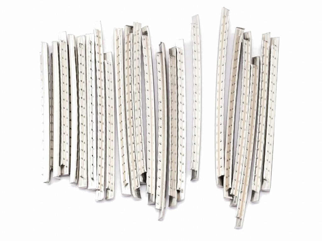 Kit com 20 trastes de inox prontos para a instalação angulados com raio de 12", servem para qualquer guitarra com 6 cordas ou violão, o raio final pode ser ajustado conforme o raio do braço durante instalação ou retífica.